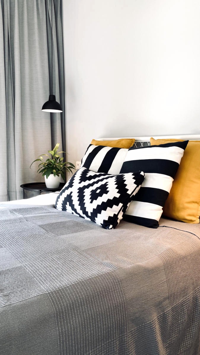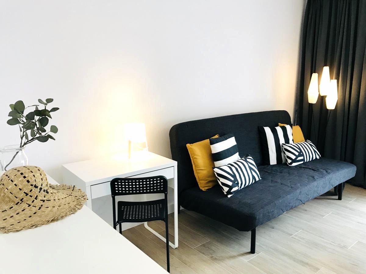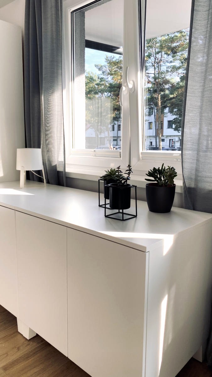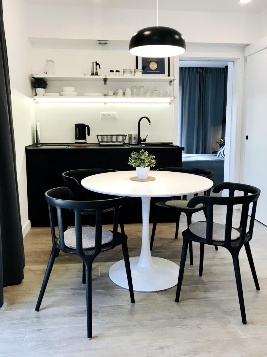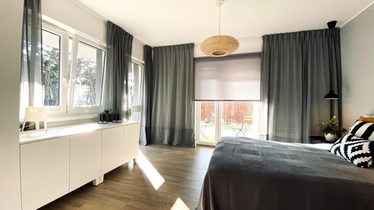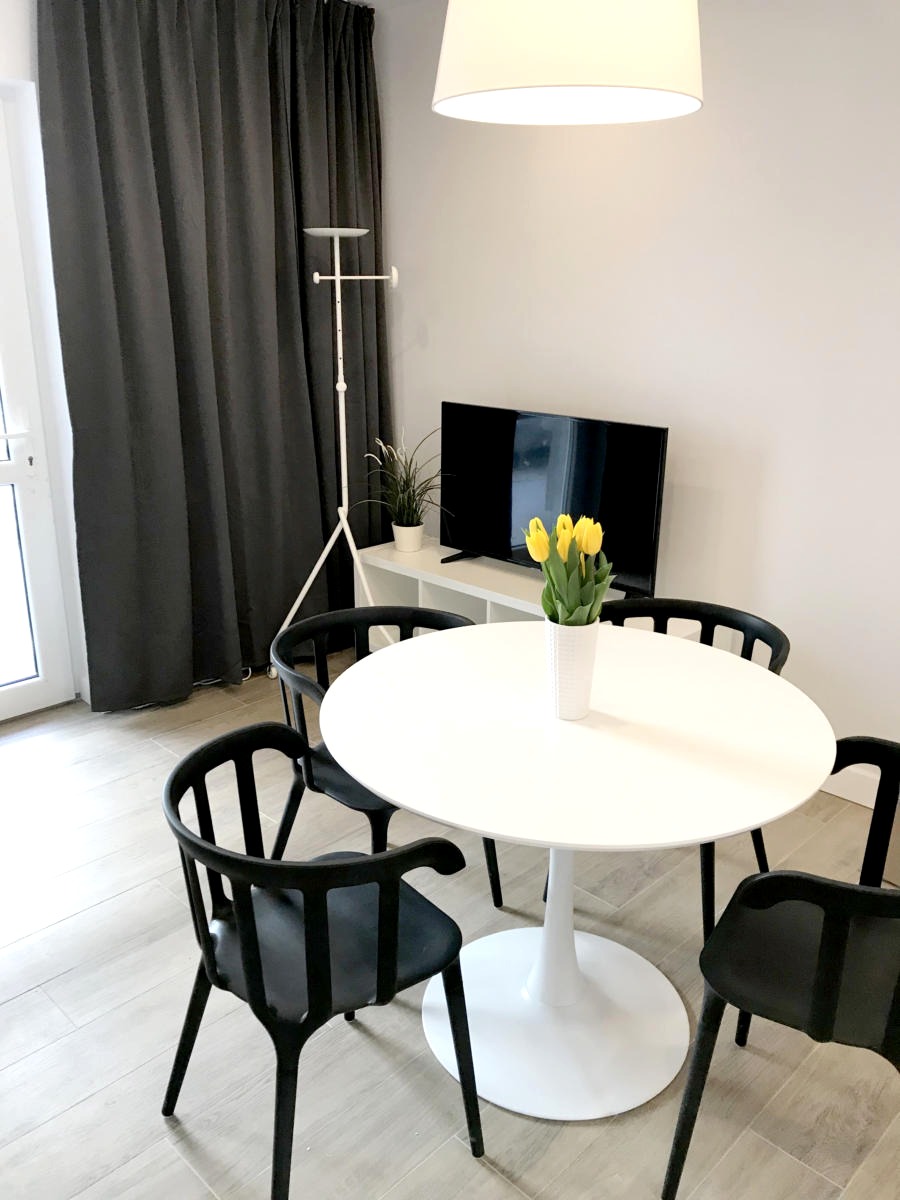 Jasny apartament z pokojem dziennym i aneksem kuchennym oraz oddzielną sypialnią. Duże okna balkonowe zapewniają dużo światła, a drewniany taras zachęca do spokojnych śniadań i porannej kawy.